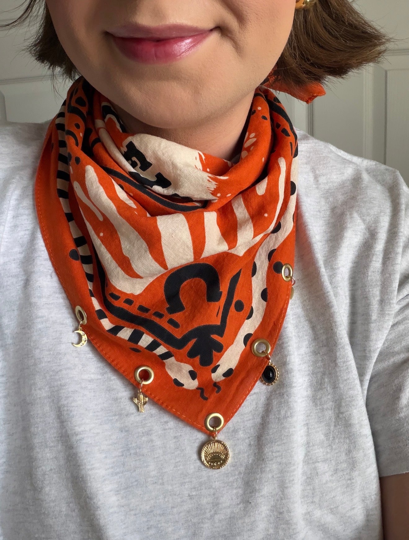 this 22" bandana features 5 charms on gold grommets, and since you tie it yourself, it can be adjusted however you'd like--there is no clasp.
