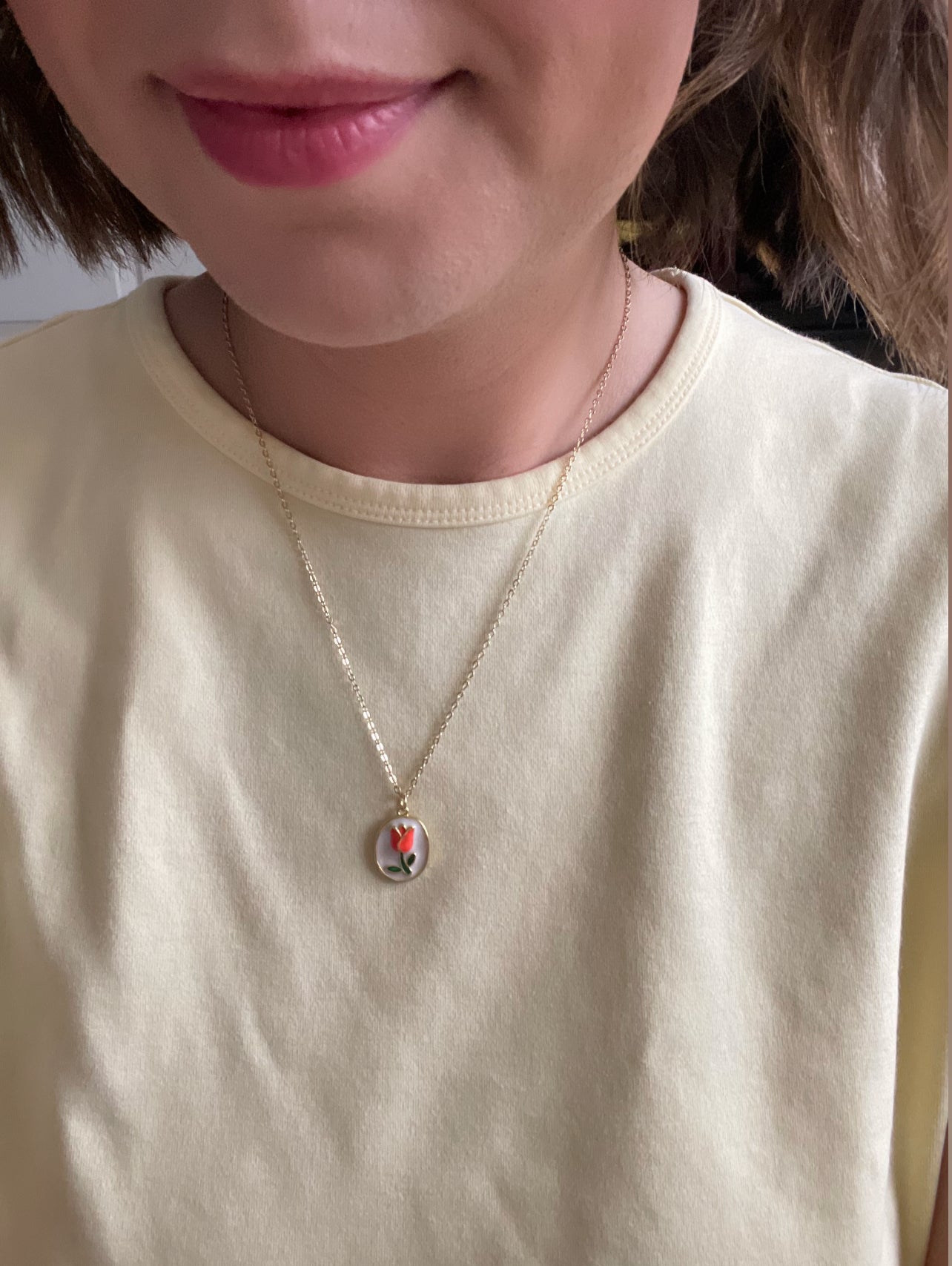 named after annie from "practice makes perfect" by sarah adams, this gold tulip necklace is hypoallergenic and nickel free