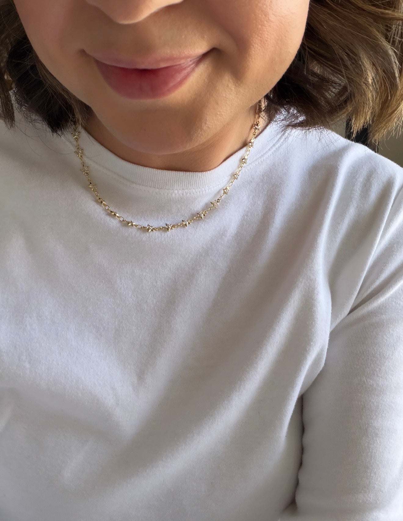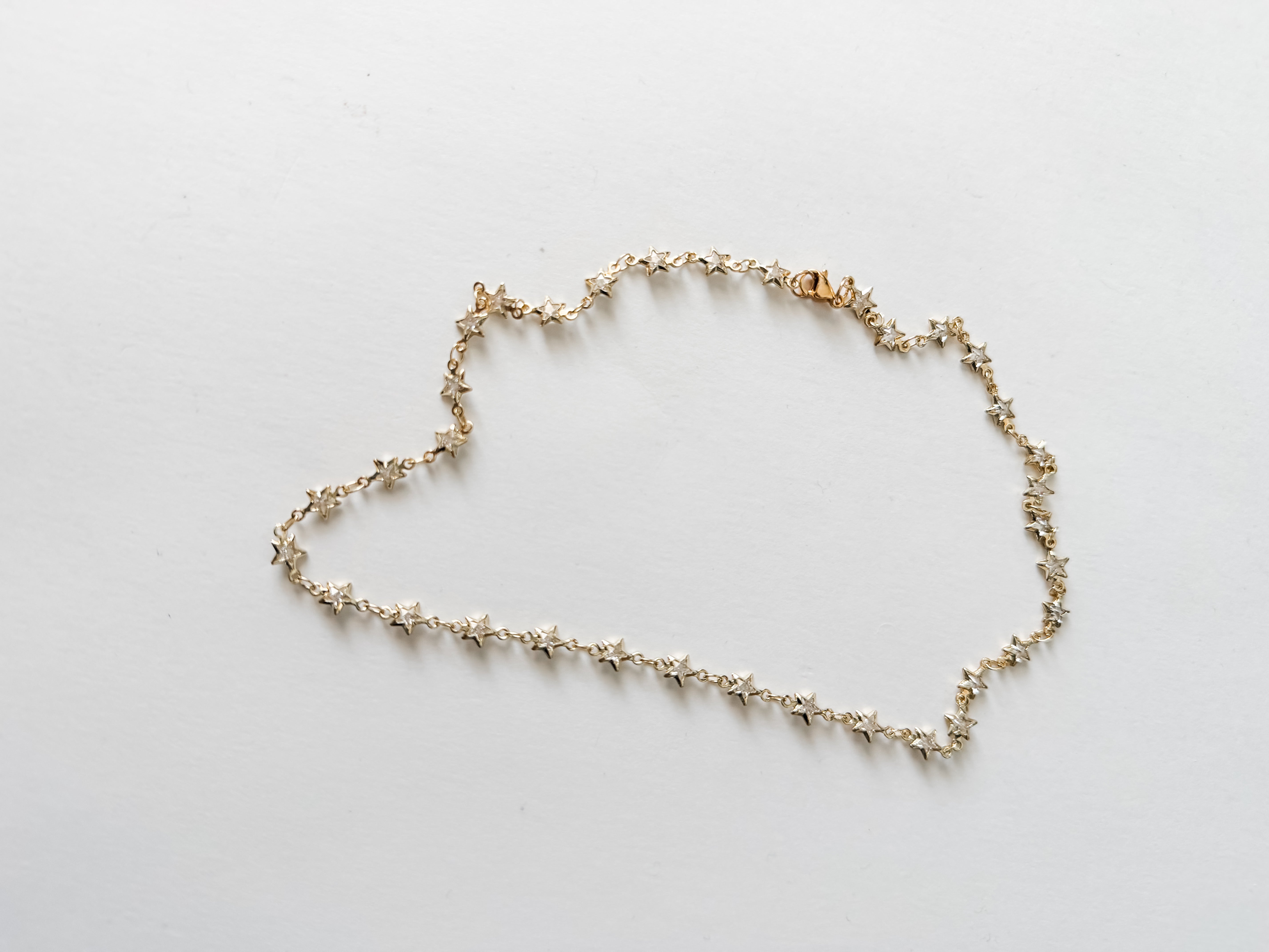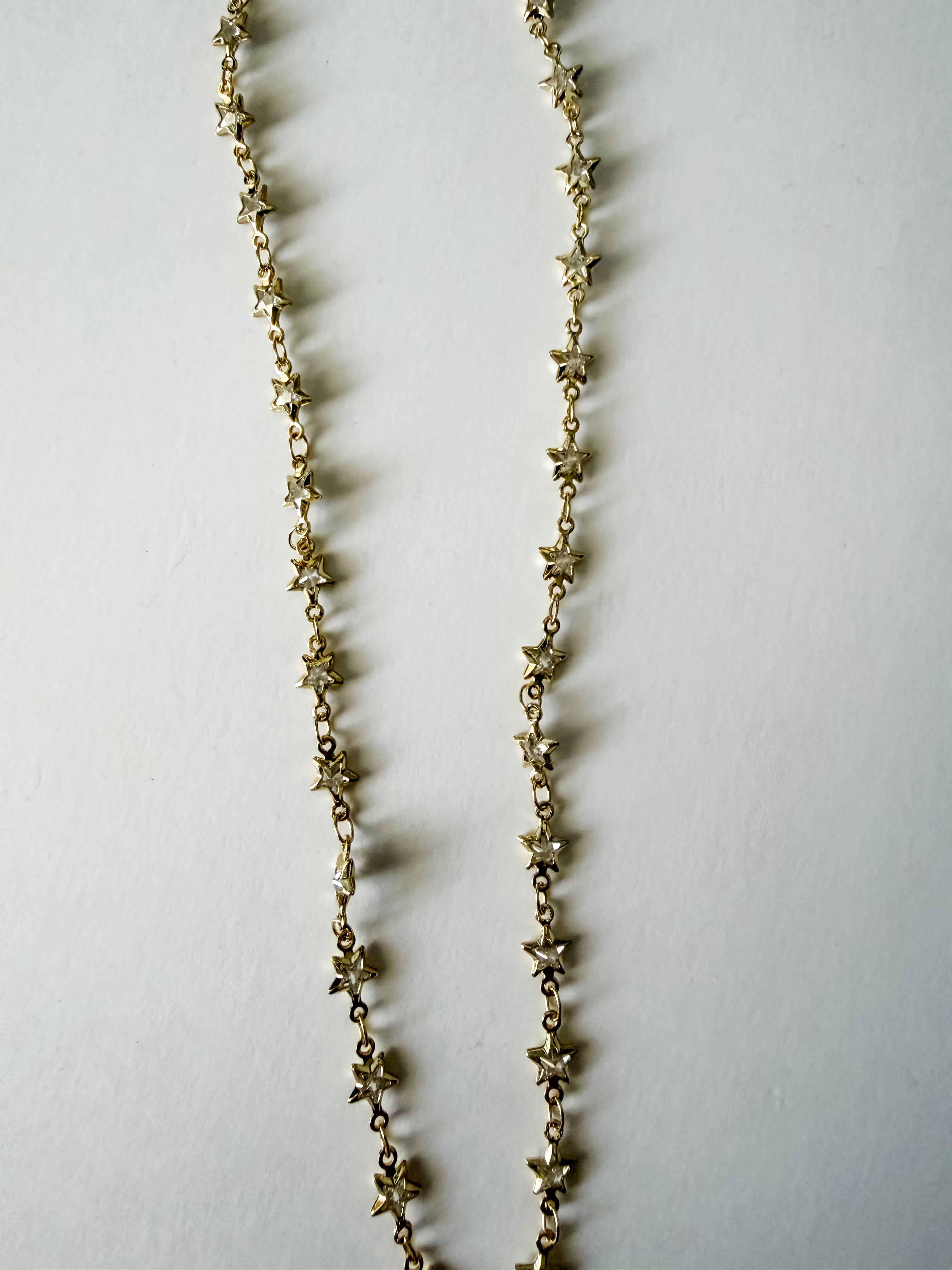 this gold filled chain features small crystal stars, and is hypoallergenic and nickel free.