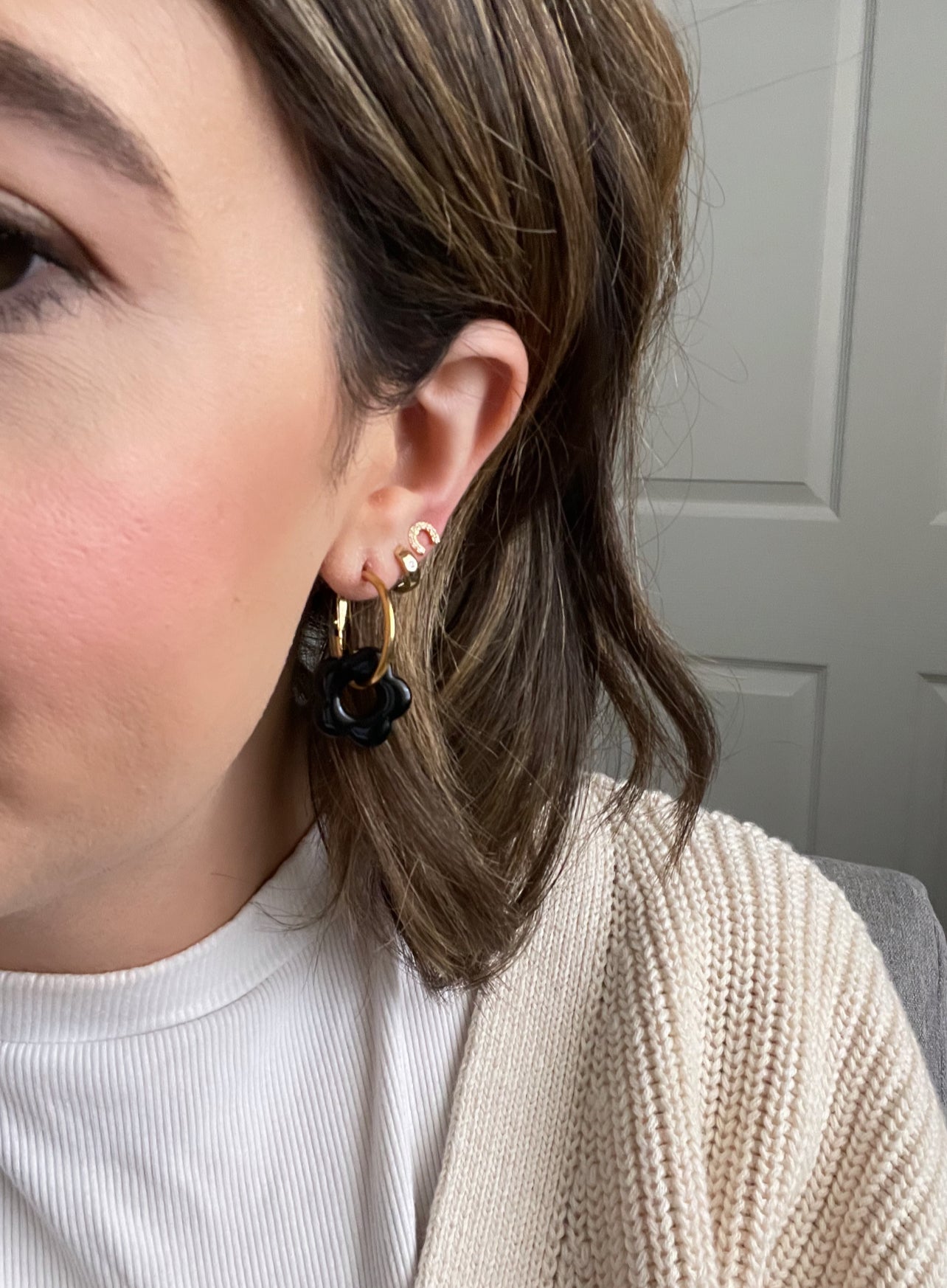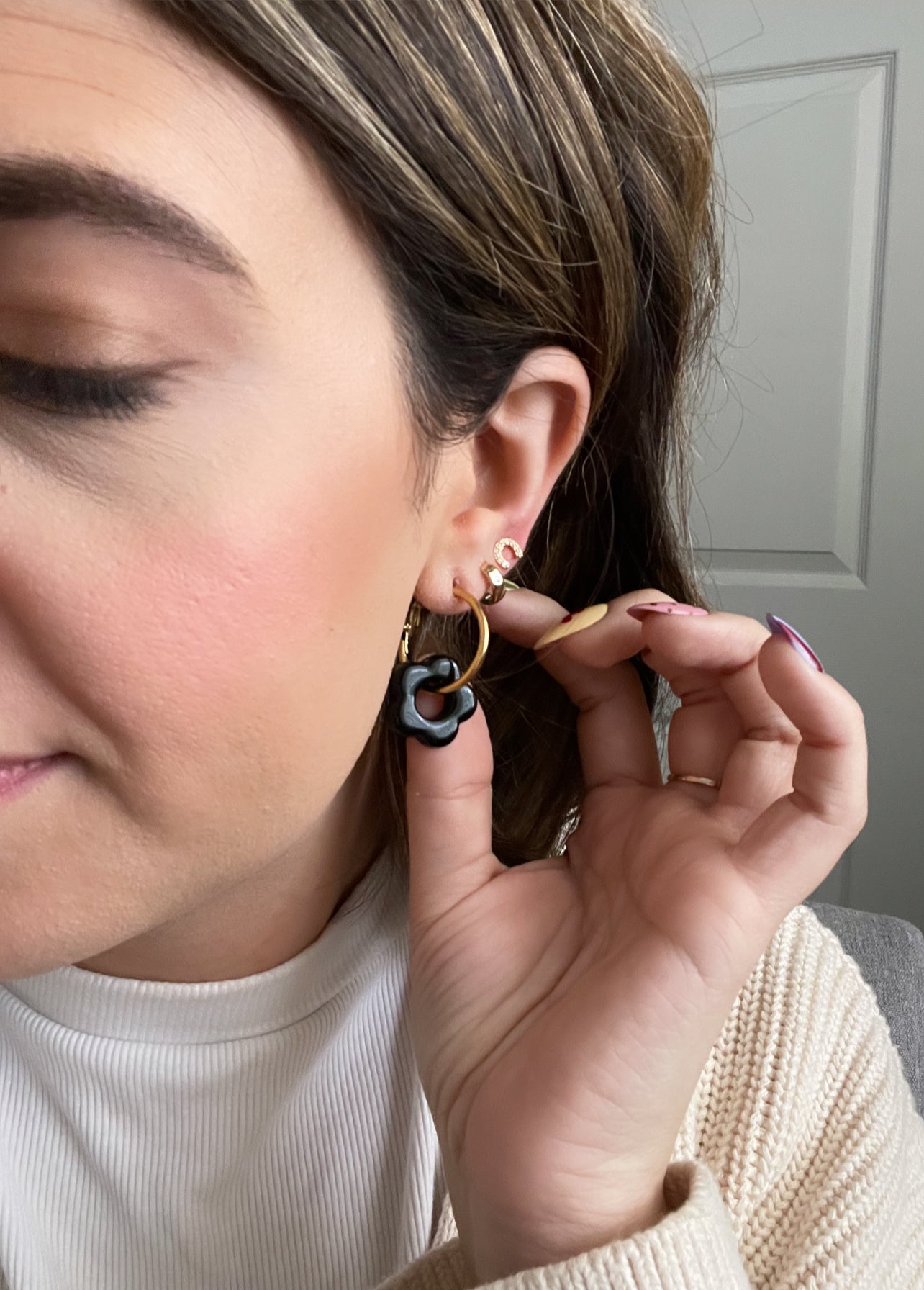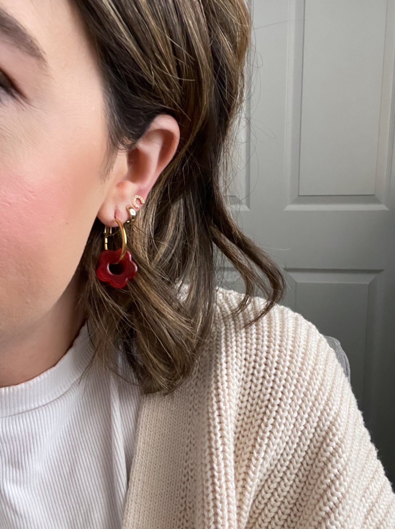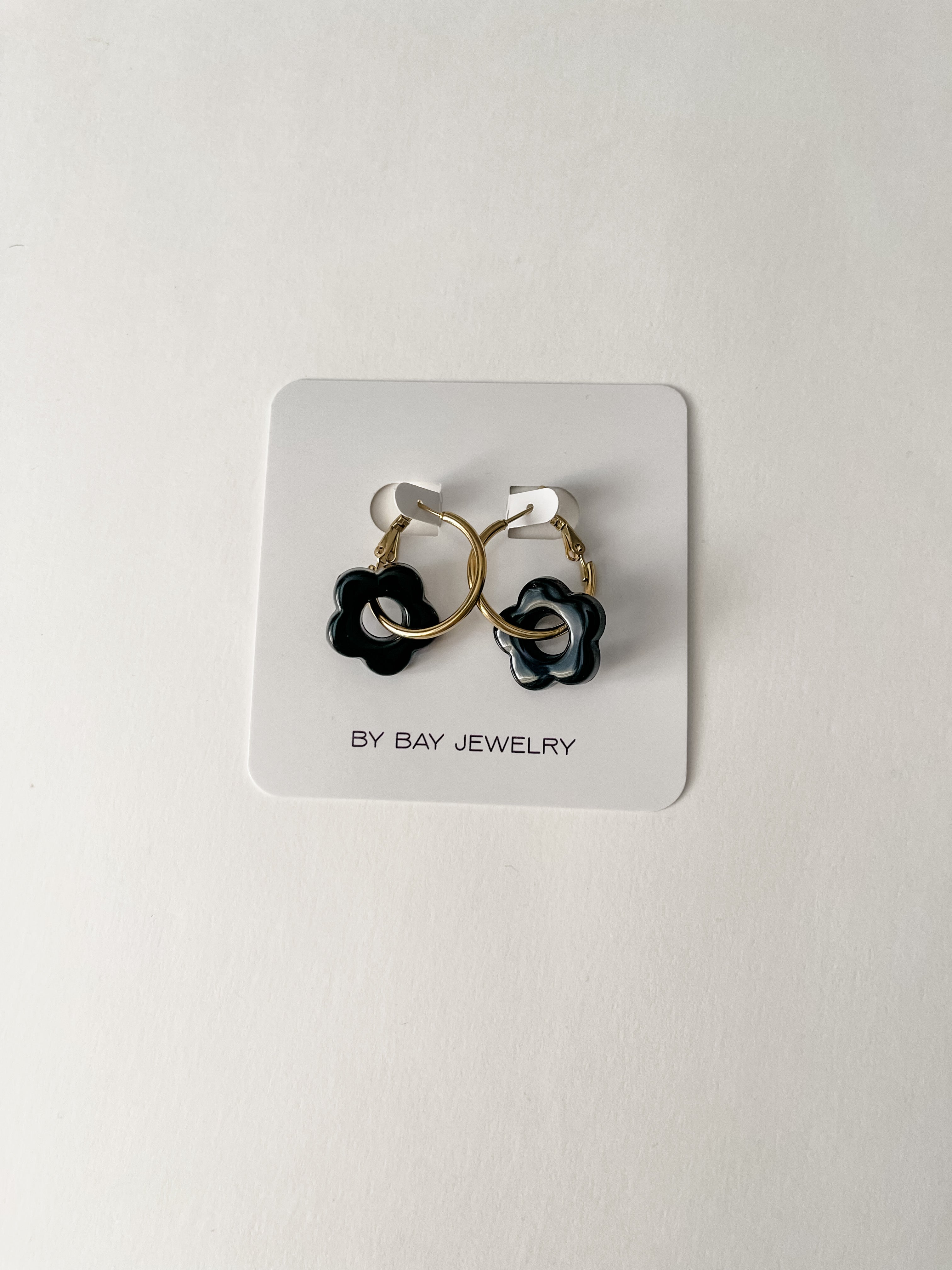 these hoops feature a resin flower charm, and are hypoallergenic and nickel free. available in red and black.
